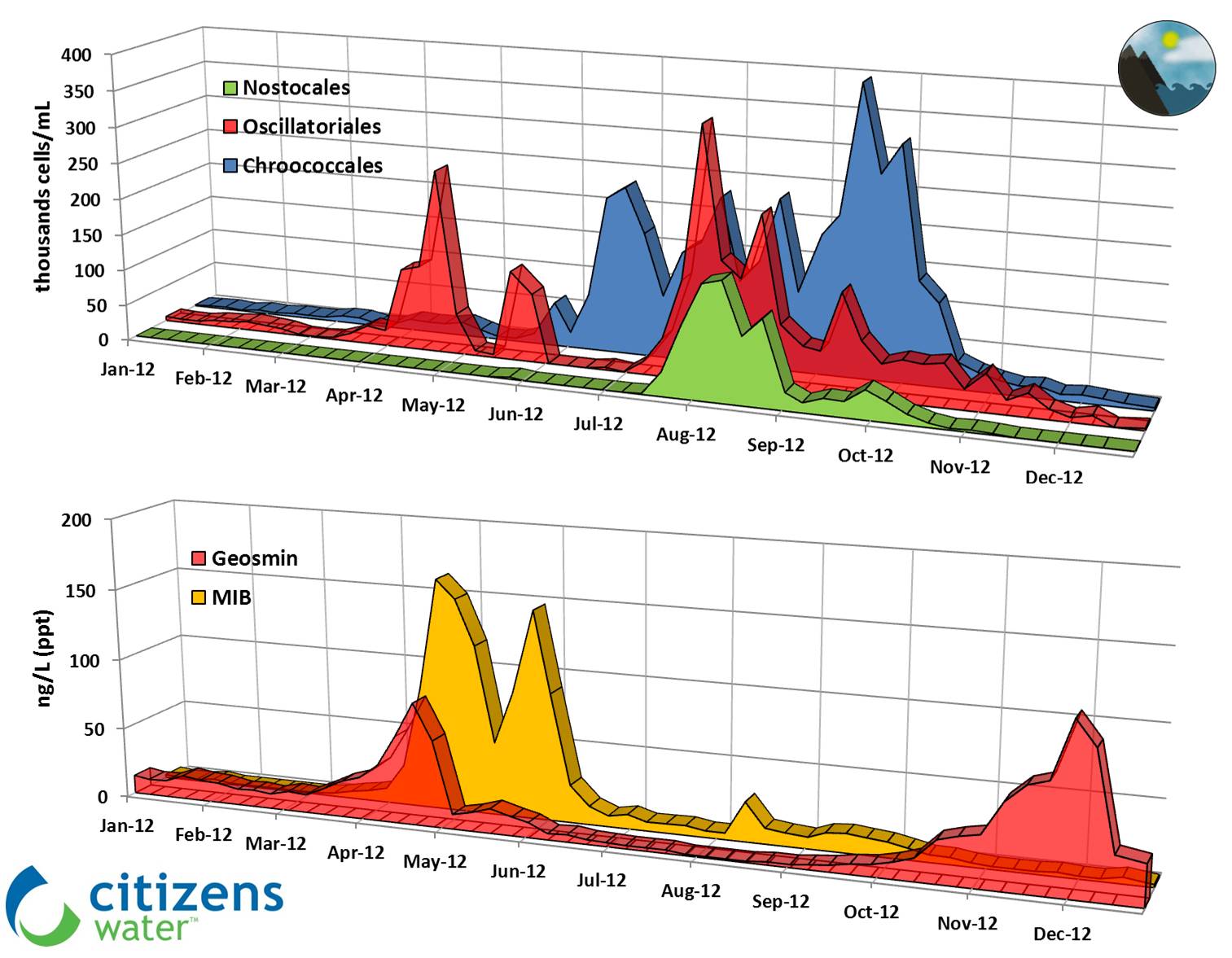 The development and proliferation of algal blooms likely result from a combination of environmental factors including available nutrients, temperature, sunlight, ecosystem disturbance (stable/mixing conditions, turbidity), hydrology (river flow and water storage levels) and the water chemistry (pH, conductivity, salinity, carbon availabiliy).